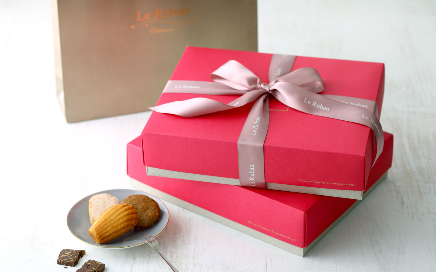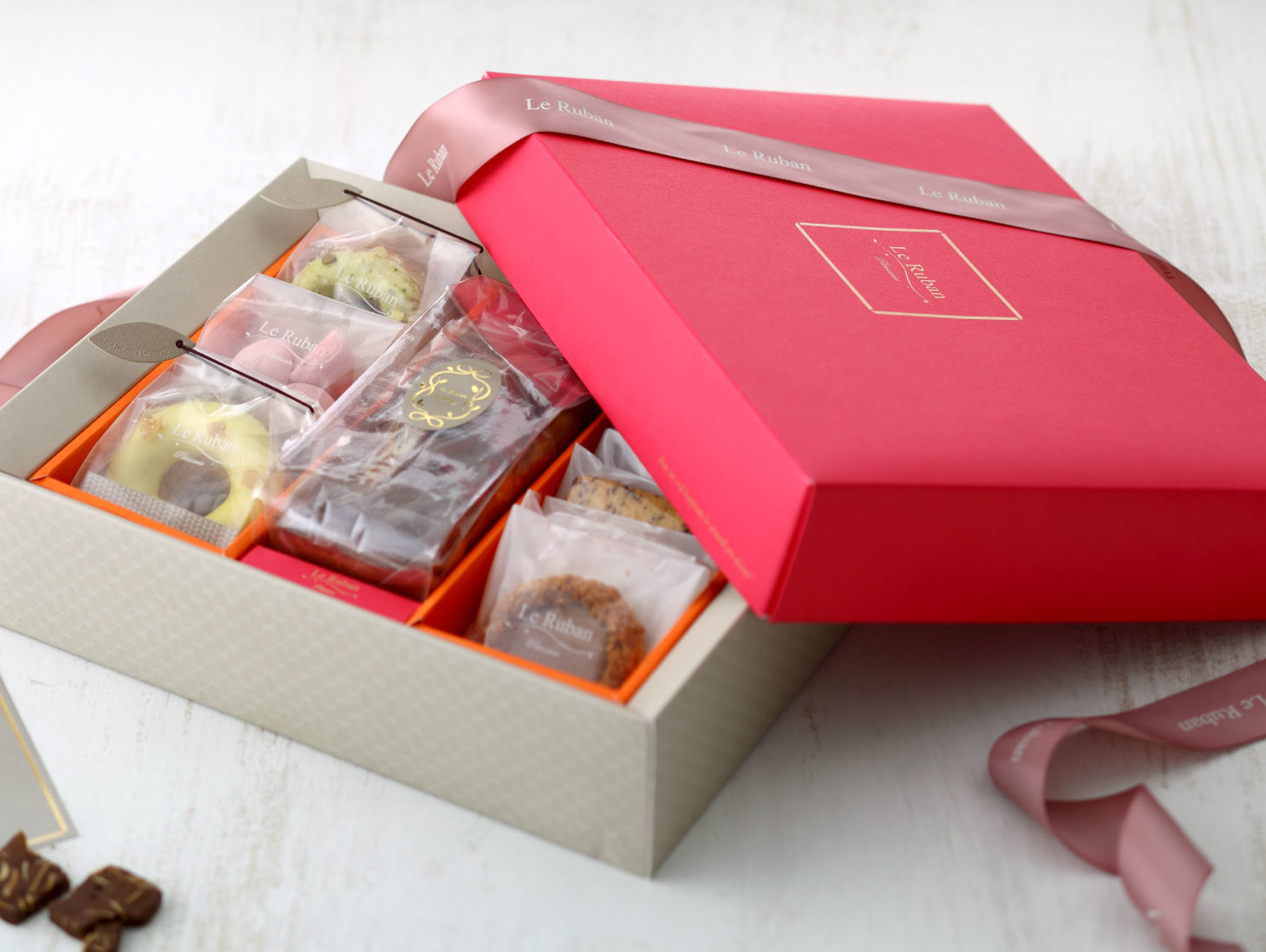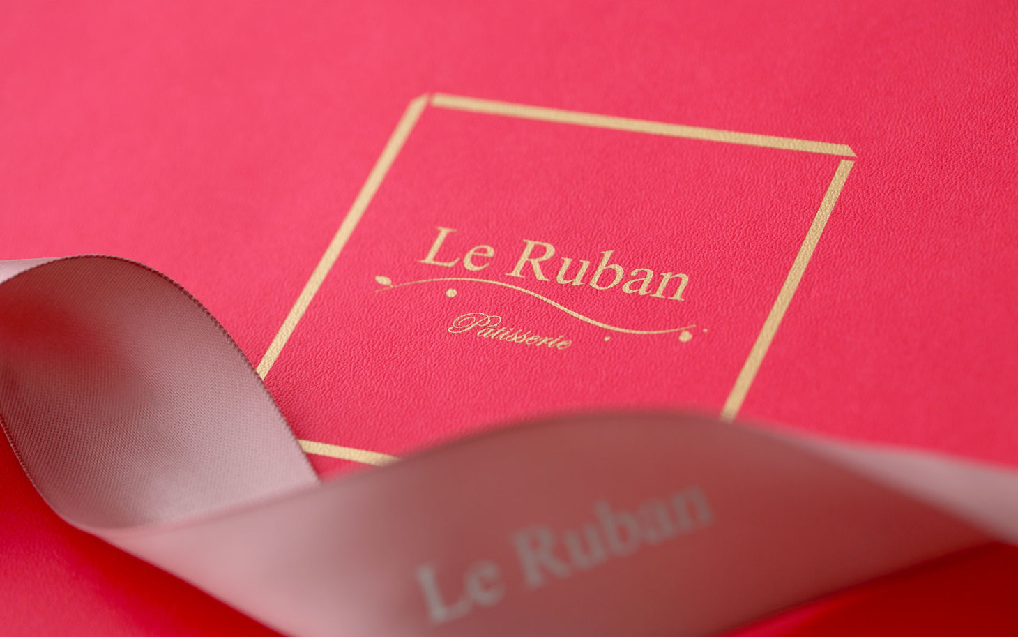 Ruban 在法文代表「緞帶」,象徵包裹祝福的溫度。喜餅設計以緞帶作為核心視覺,呈現法朋對幸福儀式的重視,也延續品牌優雅細膩的法式風格。