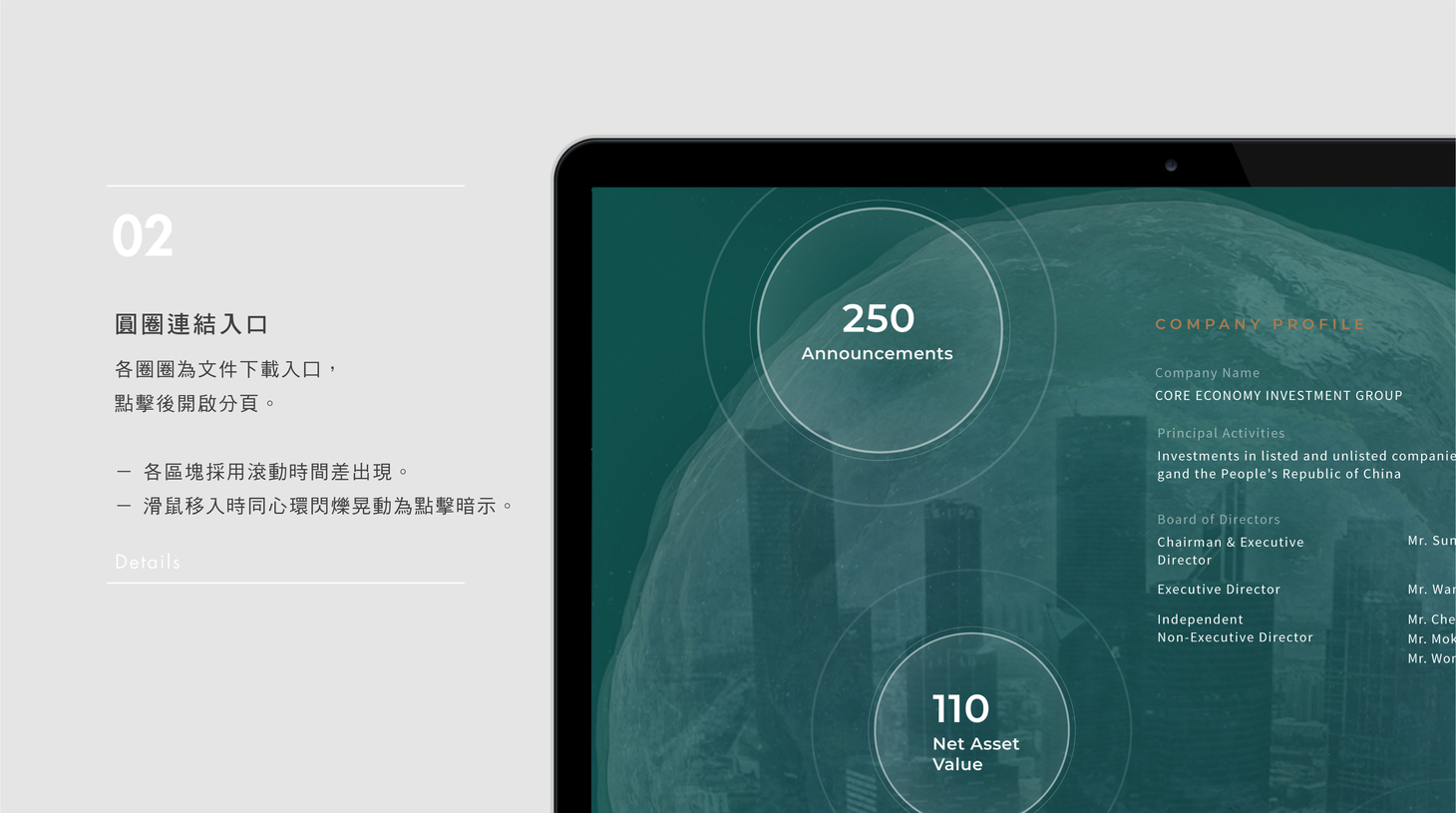 識別設計圍繞「核心」的啟動、聚焦與延展,讓品牌在圖形、比例與佈局上具備一致性與深度。視覺節奏呈現投資思考的有序、專注與前瞻,強化企業的穩健形象。