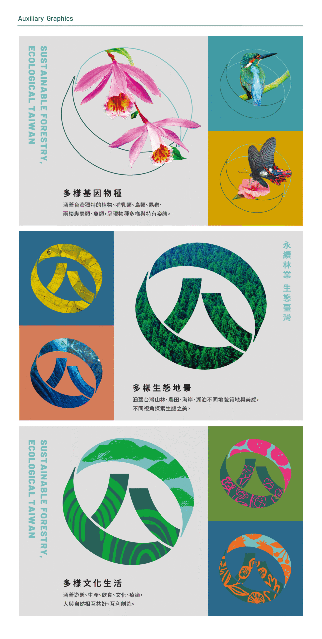 品牌輔助圖紋透過影像、筆觸與肌理交織,象徵基因、物種、生態、地景、文化與生活等多層次生命樣貌。視覺系統呈現環環相扣的生物多樣性,讓永續不只是理念,更成為可被感受的意象。
