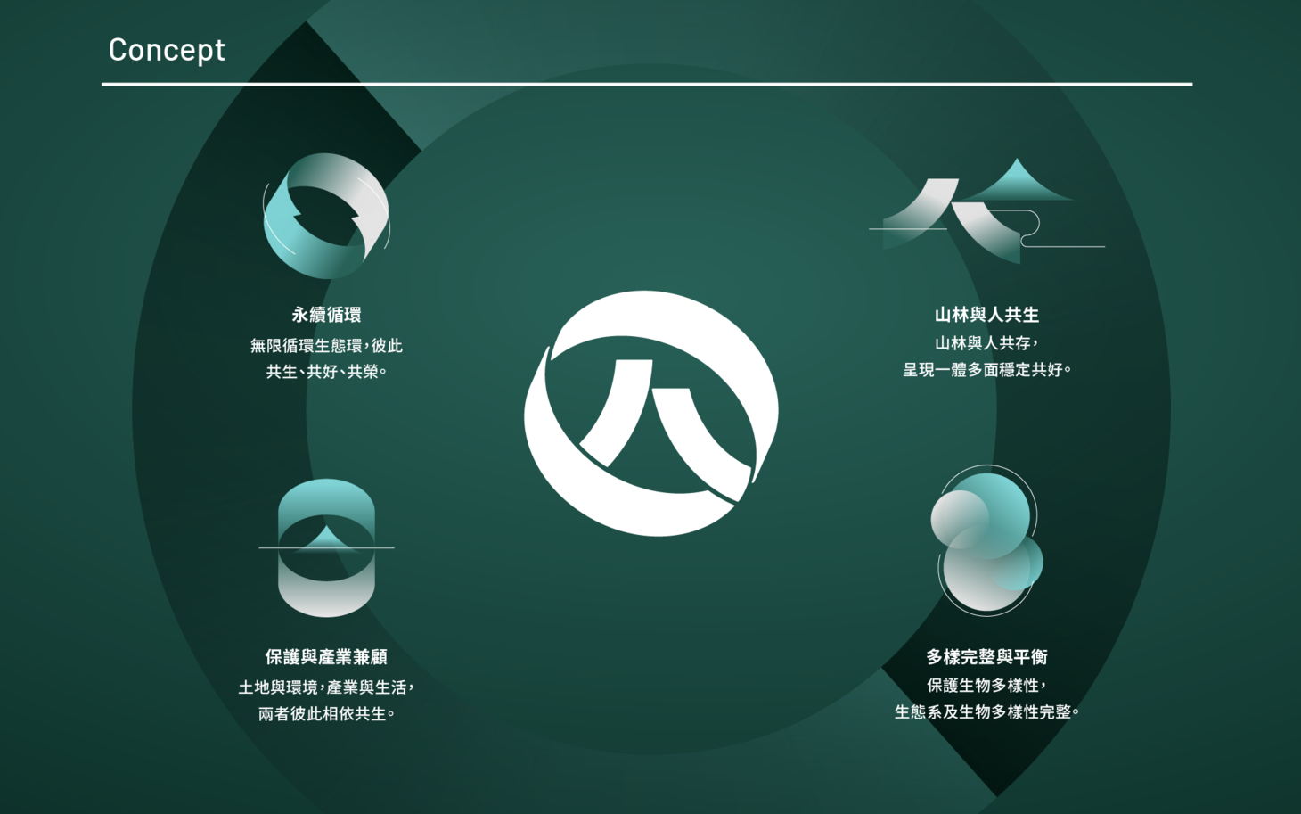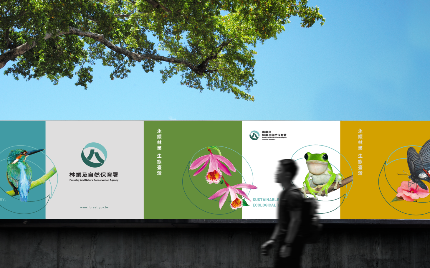 新識別中的中心符號同時是一個人,也是樹木與山形的延伸。此符號承繼原林務局印象,並轉化為更具時代感的語彙,象徵森林治理、自然保育與全民共享的整合願景。