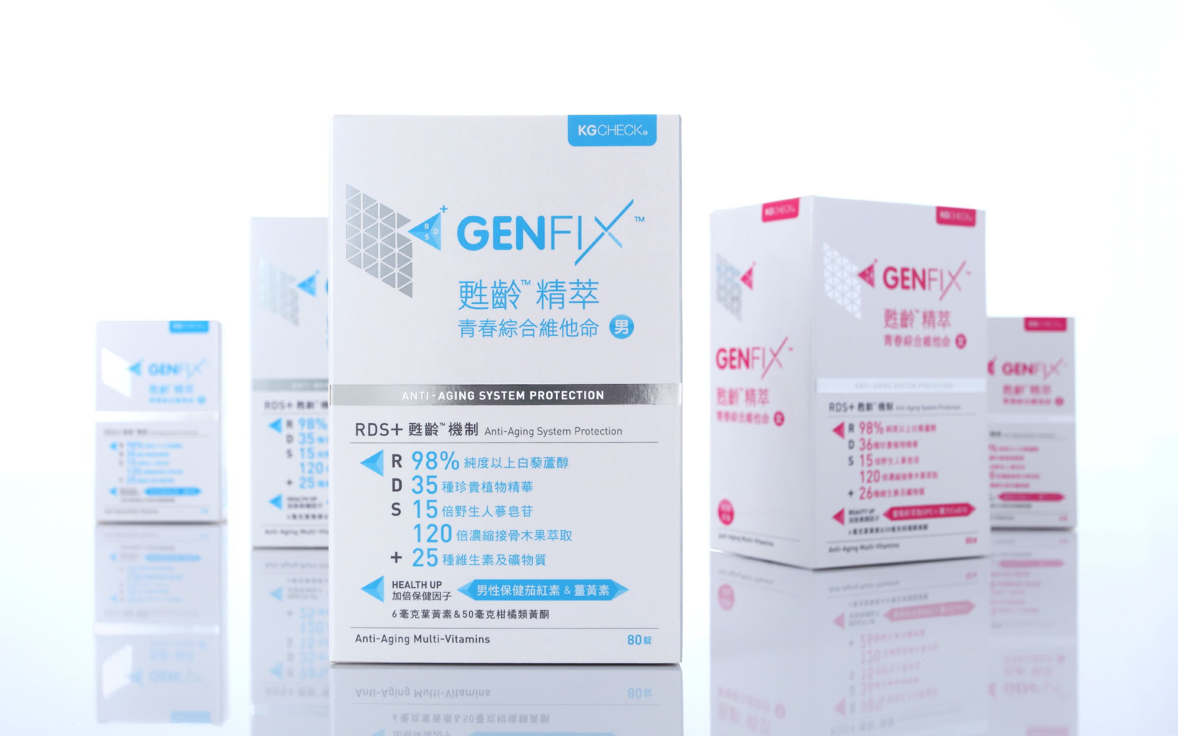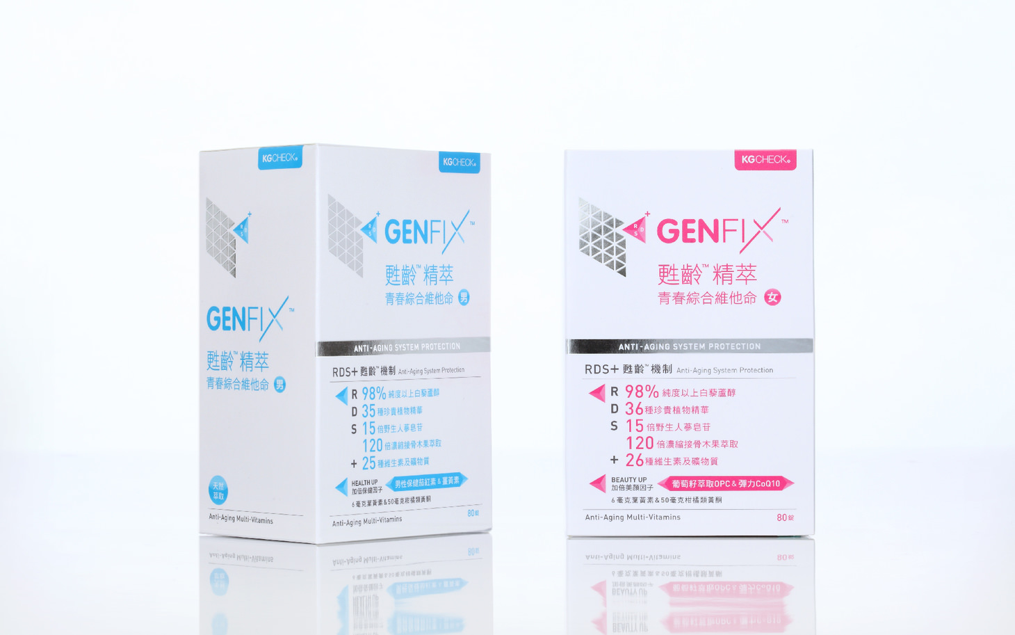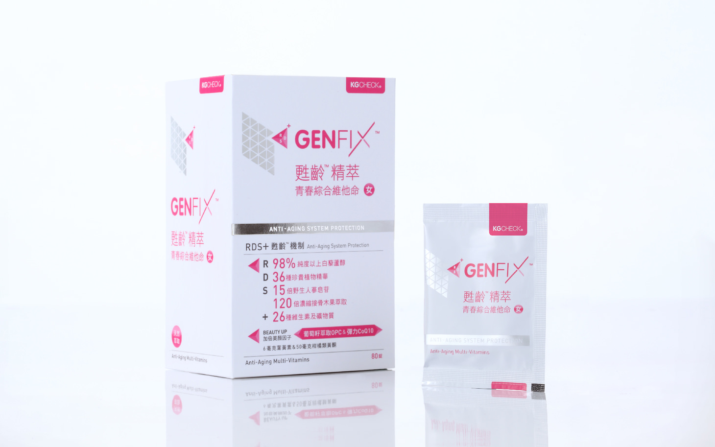 色彩與排版語彙以「科學 × 精煉」為主軸,傳遞 Genfix 從基因修復身體、由內而外調整體質的品牌核心,建立消費者對產品機能的信任感與使用期待。