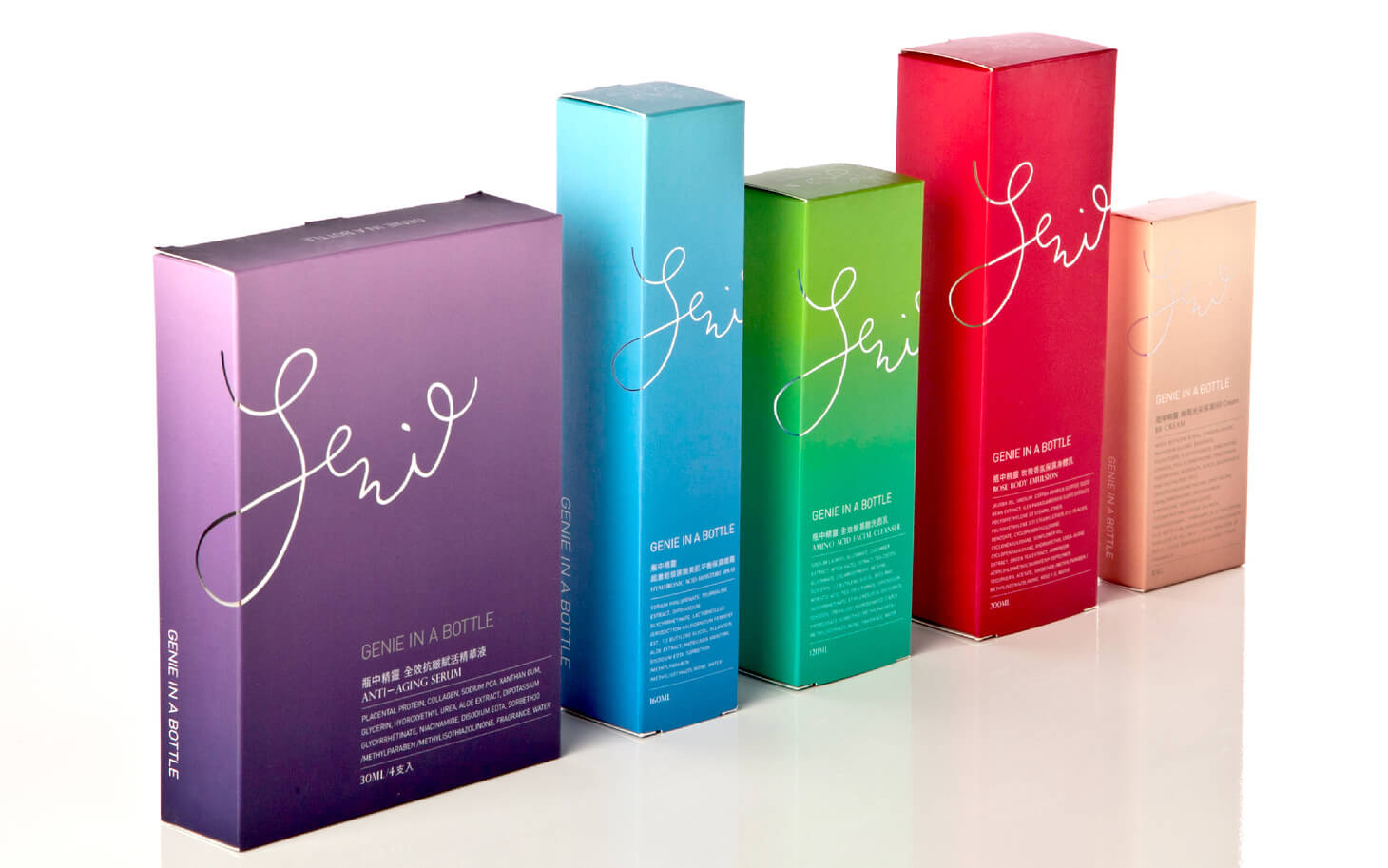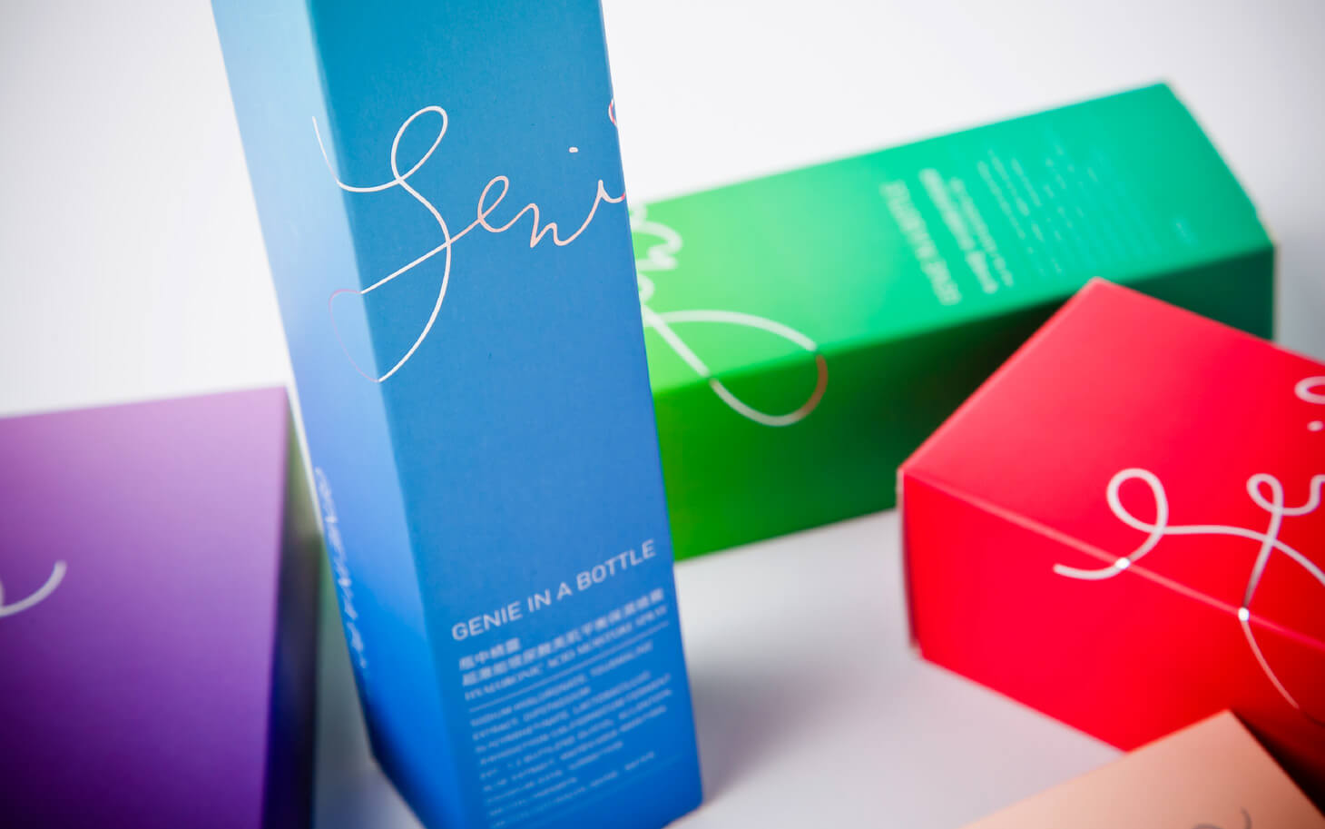 包裝設計以繽紛而不浮誇的色彩搭配輕巧筆畫,塑造出「魔幻但專業」的視覺語言。視覺風格兼具醫美的潔淨、女性品牌的優雅與精靈意象的活潑,使產品在陳列上保有辨識度與親近感。