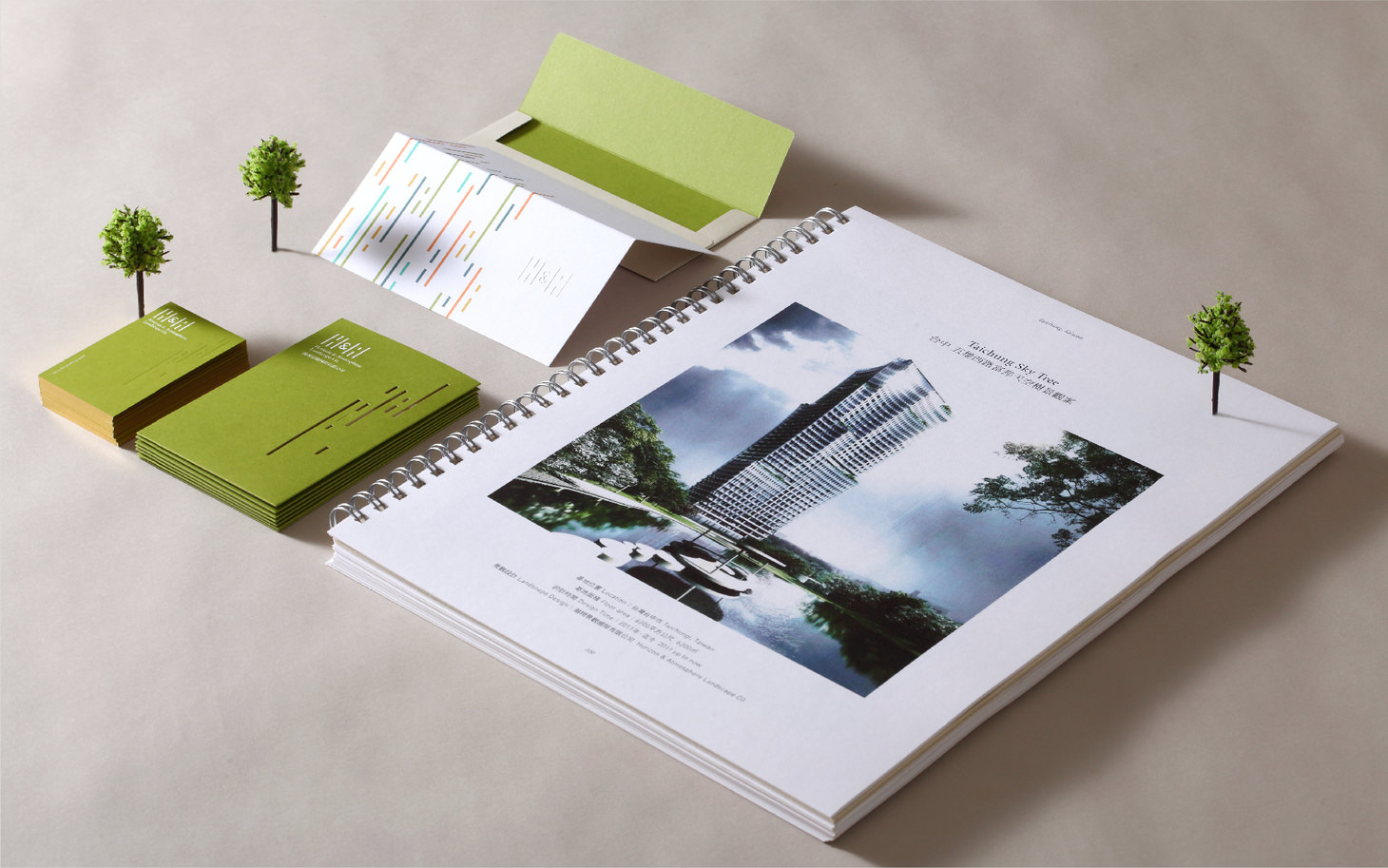 識別設計完整延伸至事務用品、作品提盒、作品集到形象廣告,統一品牌語氣,讓瀚翔景觀的專業作品與理念能以更清晰、更有層次的方式呈現。