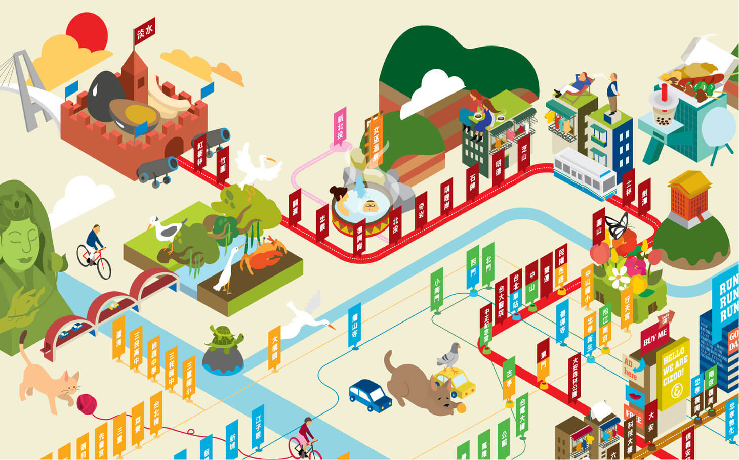 捷運系統穿梭地上與地底,帶領人們經過城市的可見與不可見。每一個站點是「點」、軌道路線是「線」、沿途街景與城市截面則是「面」,共同構成一趟立體的空間體驗。囍樹以此為起點,重新定義捷運地圖的觀看方式。
