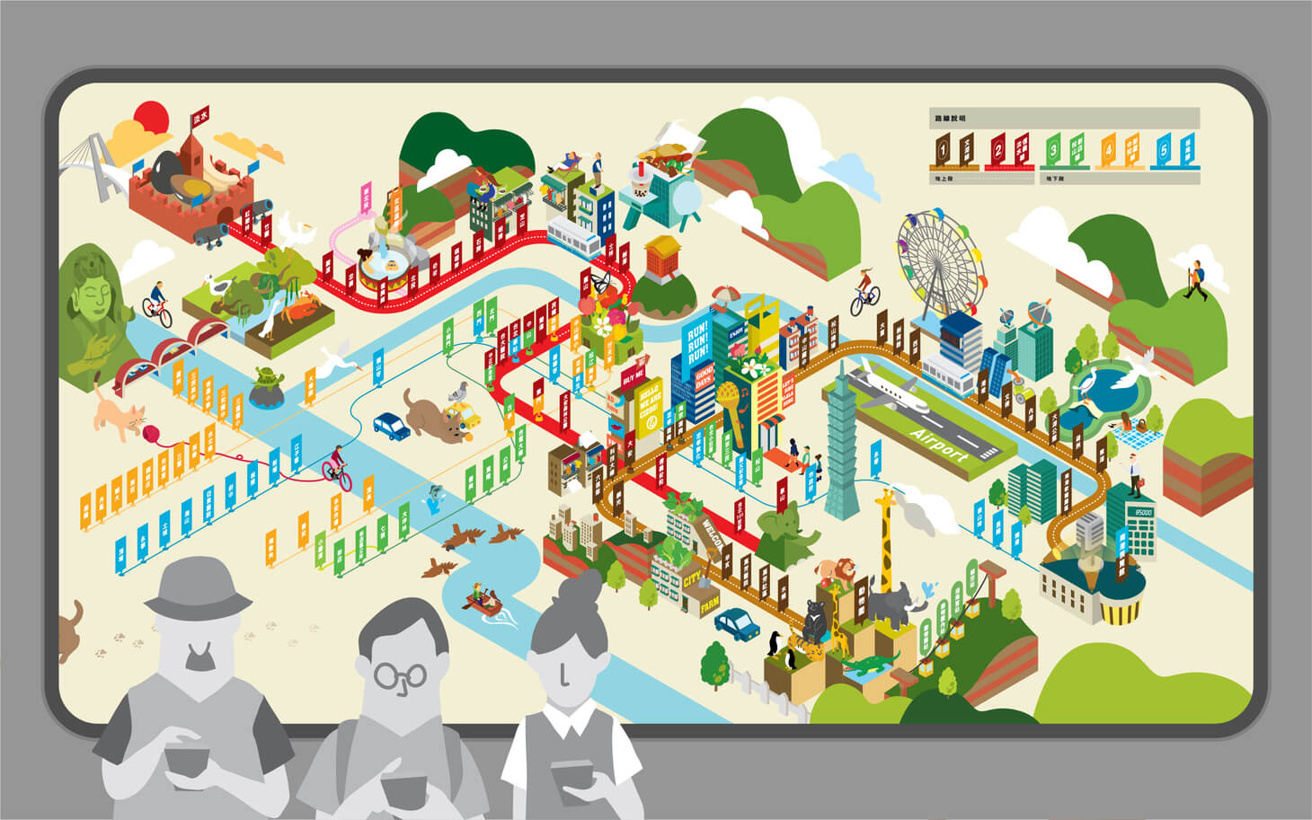 捷運地圖 Re-Design 嘗試打開一個重要的提問——當每個人都低頭滑手機,我們是否錯過了城市最值得被看見的片刻?透過簡潔的視覺語言與友善資訊架構,展覽鼓勵使用者回到生活現場,重新建立與城市的連結。
