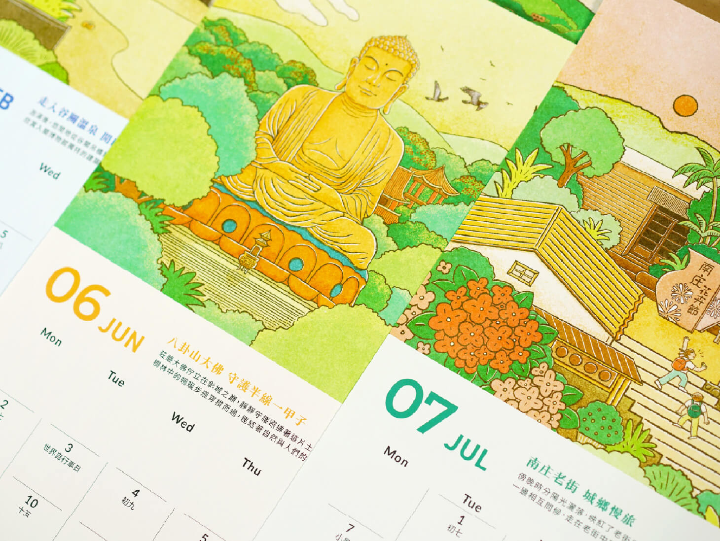 本次與插畫家「隨想隨詩 Shiwen Studio」合作,透過溫暖細膩的筆觸,重新描繪十二處具代表性的建築場景。畫面融合建築形式、地景層疊與人物活動,讓每個月份都成為立體的時空場景,既是旅遊指引,也是文化記事。