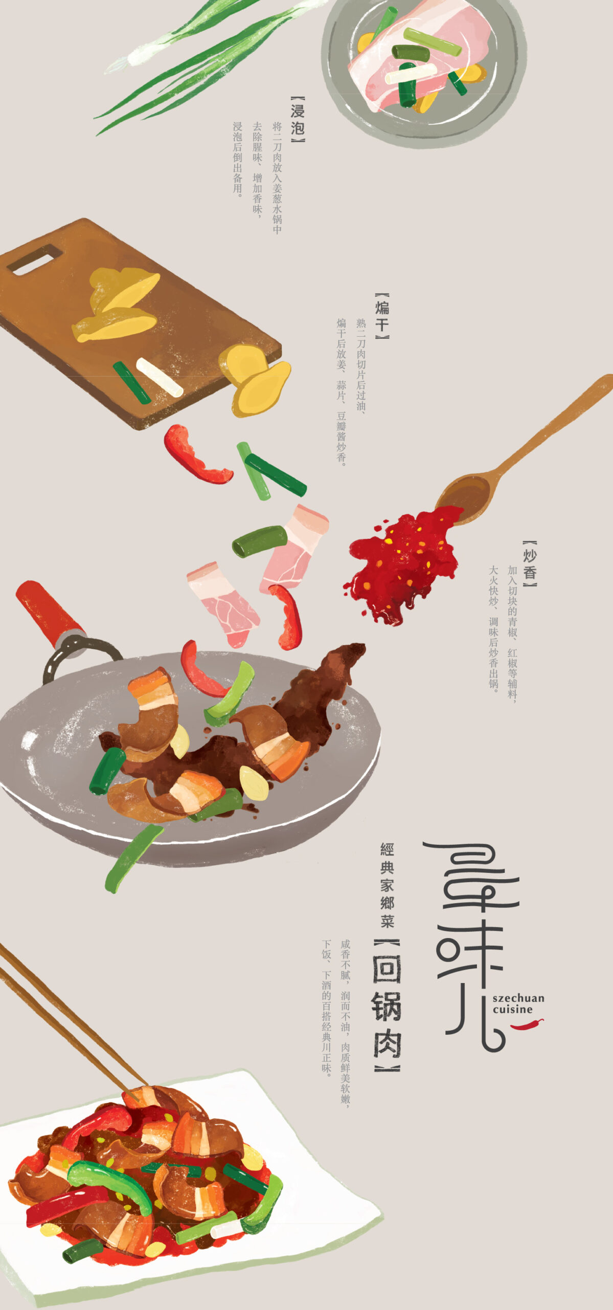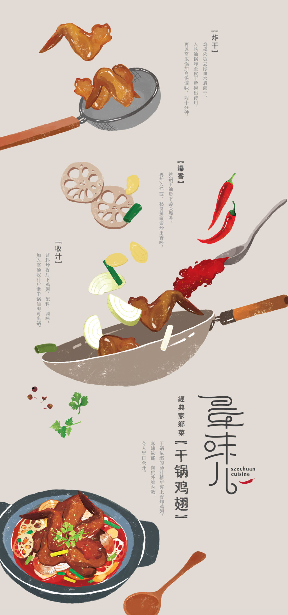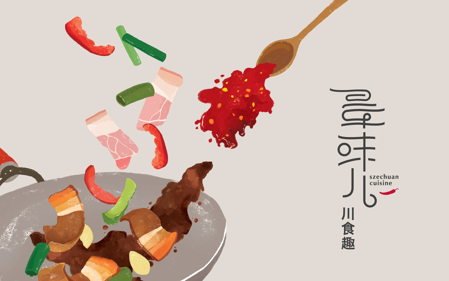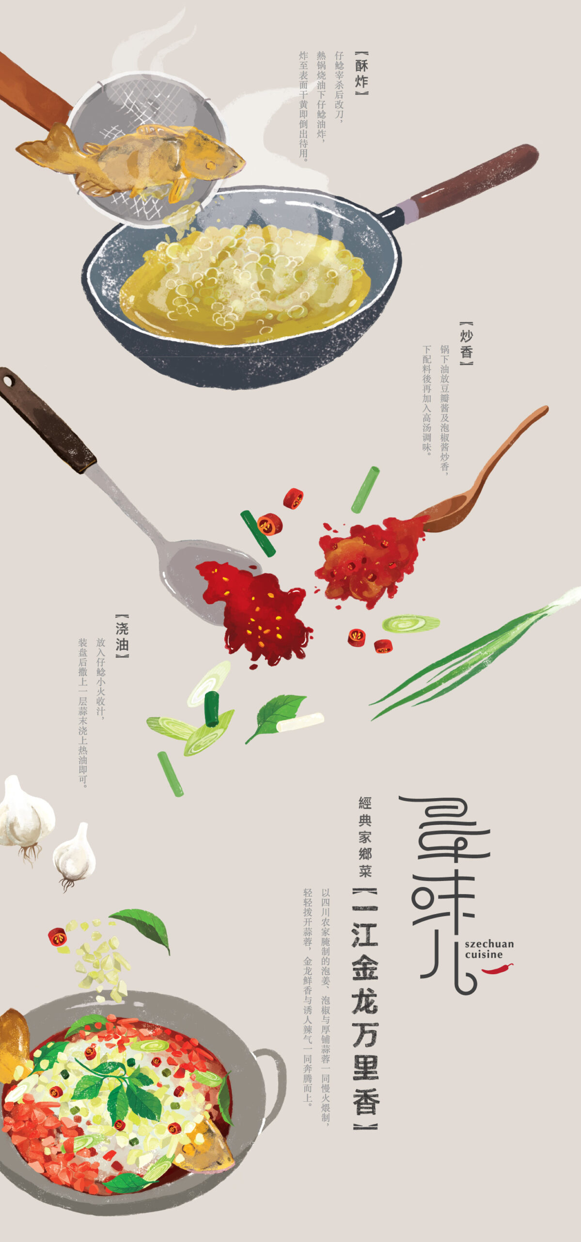 視覺設計以插畫式食譜為主軸,描繪川菜做法、食材與香氣層次,讓味道在視覺上也能「看得到」。這種圖像筆調,使川菜的日常感、親切感與食趣更具溫度。